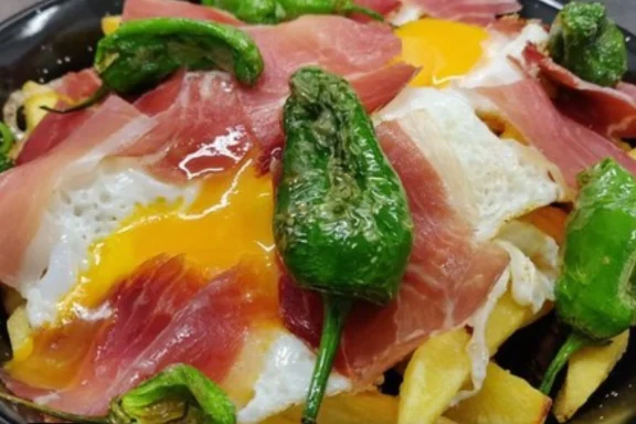 Patata casera , morro de cerdo , huevos fritos, pimientos del padrón y salsa gaucha